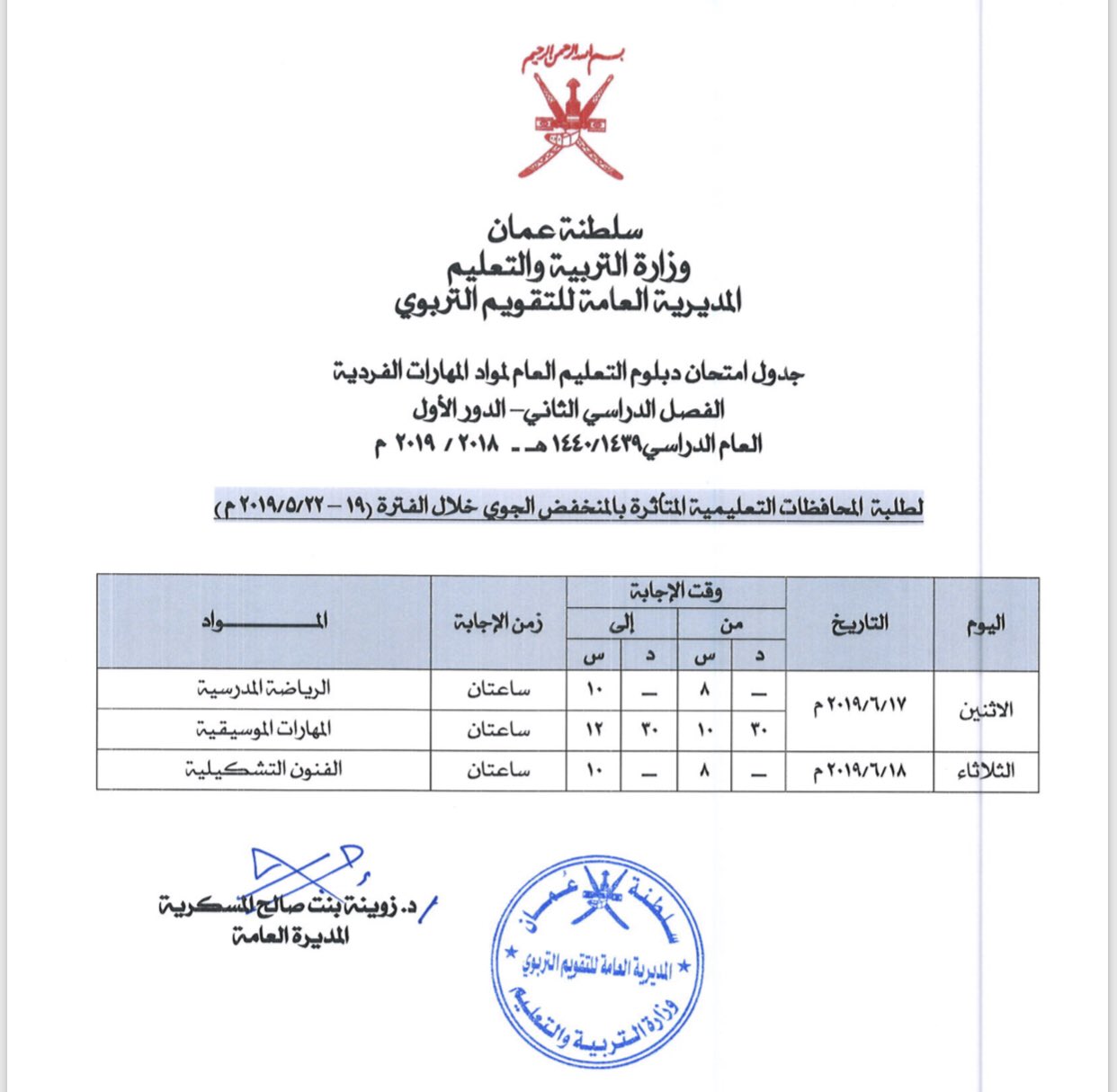 جدول امتحان دبلوم التعليم العام ع مان 2018 2019 مهارات فردية